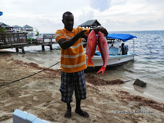 Roatán es un lugar ideal para hacer submarinismo y sacarse el PADI (no mucho más caro que en Utila, según nos han comentado) pero nosotros nos hemos decantado por el snorkel. A tan sólo unos metros de la playa más bonita de la isla, West Bay (¡y prácticamente la única!), está la famosa barrera de coral. Allá con unas simples gafas y un tubo se pueden ver maravillas: todo tipo de peces de colores y de todos los tamaños, langostas, estrellas de mar y, con un poco de suerte... tortugas marinas. Uno de los días decidimos marchar con un pescador que nos descubre lugares todavía más espectaculares. En agua el tiempo se nos pasa volando...